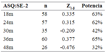 El poder estadístico o potencia de cada cuestionario fue adecuado excepto para los cuestionarios de 30 y 48 meses que tuvieron poco poder estadístico para detectar la validez de un ítem posiblemente por tener un tamaño muestral pequeño.