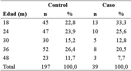 Se analizaron 236 cuestionarios del ASQ:SE-2, correspondiendo a 229 niños cuyos intervalos de edad de los cuestionarios estuvieron entre 18-48 meses. De ellos 137 (58%) correspondieron al sexo masculino y 99 (42%) sexo femenino. Los cuestionarios considerados controles fueron 197 (83,5%), mientras que los casos 39 (16,5%). No hubo diferencia estadísticamente significativa entre el grupo de hombres y mujeres con respecto a la condición de casos (p=0,155); es decir, los casos pudieron presentarse tanto en hombres como en mujeres con la misma probabilidad. Según la Tabla 1 la distribución por intervalos de edad y condición de controles o casos, estuvieron distribuidos de manera casi homogénea. Tampoco hubo diferencia estadísticamente significativa entre ambos grupos por edad (p=0,638).