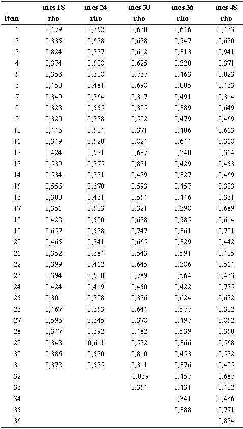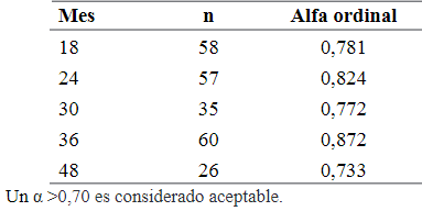 Validez de Ítems: Como se muestra en la tabla 3, los valores de la correlación ítem-test (r) para los 5 cuestionarios fueron altos (r>0,30), indicando un buen poder discriminatorio por ítem. Sin embargo, para los cuestionarios de 30, 36 y 48 meses, hubo sólo 1 ítem que no resultó válido (ítems 32, 6 y 5 respectivamente).