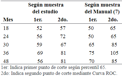 Puntos de corte: En la tabla 4, se muestran los valores hallados de los 2 puntos de corte para cada uno de los 5 cuestionarios del ASQ:SE-2 con los que se establecen 3 áreas (“dentro de las expectativas”, “monitoreo” y “riesgo”). En la misma tabla 4 para efectos comparativos se adjuntan los valores de primer y segundo puntos de corte según lo hallado en el presente estudio y los indicados en el Manual del ASQ:SE-2 original.