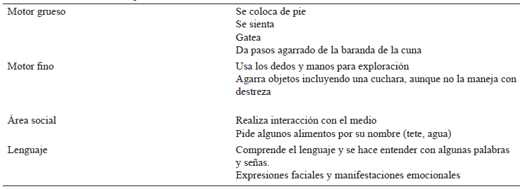 Con respecto a su evolución psicomotriz, el niño se sienta, gatea, agarra objetos, come solo, lo que indica que ha superado por completo los problemas de deglución. Aunque el niño presenta un evidente déficit en sus funciones motoras y cognitivas con respecto a su edad, no presenta recidivas ni perdida de funciones o aspectos del desarrollo alcanzados, por el contrario, su curva de aprendizaje y desarrollo progresa paulatinamente en respuesta al tratamiento.