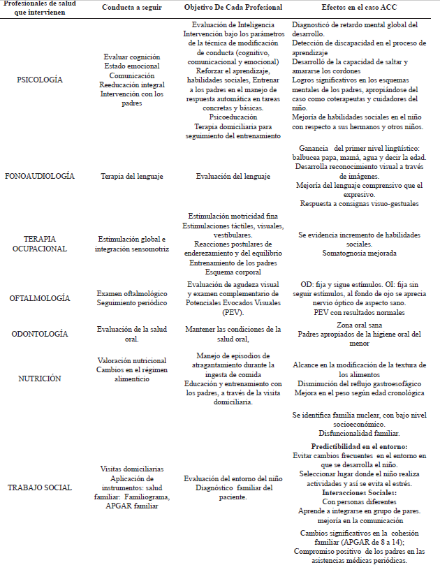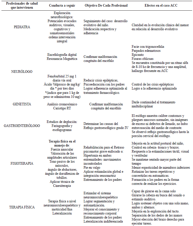 De acuerdo a los antecedentes teórico-prácticos la intervención se enfoca en las directrices dadas en la tabla 1; el seguimiento integral en el caso clínico ACC requiere ambientes estructurados y con proyectos claramente definidos, buscando la potenciación máxima de las posibilidades físicas e intelectuales del niño mediante la estimulación regulada y continuada, llevada a cabo en todas las áreas del desarrollo, con la participación de los padres, mostrándoles la forma correcta de realizar los ejercicios de tal manera que formen parte activa en el tratamiento de su hijo, de allí que el manejo de apoyo específico de los síntomas, la mejora del crecimiento y el desarrollo y las intervenciones de apoyo de los padres son clave para manejar a los niños con agenesia del cuerpo calloso (14).