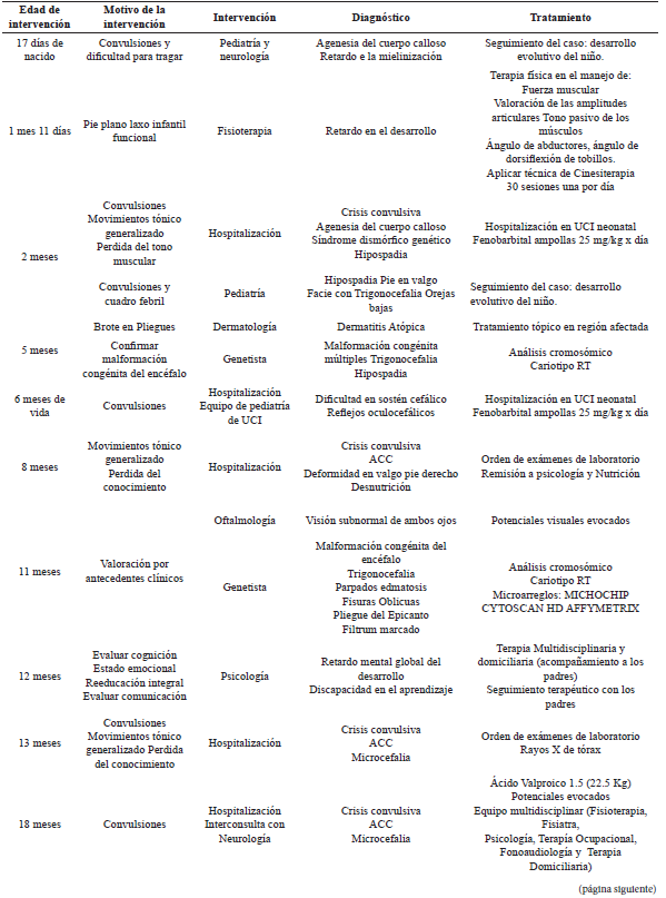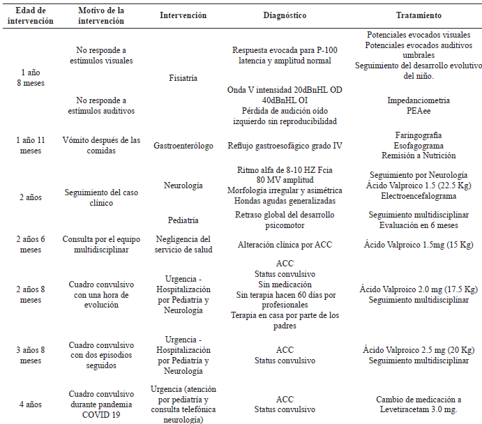 Se trata de un menor de 4 años, con antecedentes de múltiples hospitalizaciones desde sus primeros días de nacido, por crisis epilépticas, y problemas para tragar, según antecedentes perinatales, la madre niega patologías durante el embarazo e ingesta de medicamentos, u otro tipo de sustancias psicoactivas; asevera control prenatal durante el tiempo de gestación de forma puntual. Menor producto del tercer embarazo a término 37,5 semanas, por vía vaginal, con un peso al nacer de 2300 gramos, y medidas de 35 cm, alimentado a través de leche materna y leche de formula con mezcla de cereal. Al realizar la exploración respectiva se observa retraso en el desarrollo psicomotor: sostén cefálico a los 5 meses y dificultades para la sedestación, síndrome febril agudo y microcefalia. Tratado farmacológicamente con fenobarbital 25 mg 1 diaria vía oral. La conducta sugerida y atención multidisciplinar se encuentran expuestas en la tabla 2 y tabla 3 de acuerdo a la evolución del cuadro clínico.