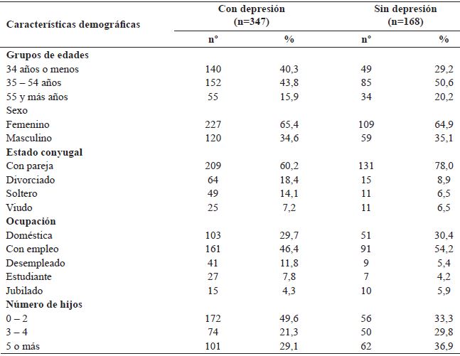 Se entrevistaron a 347 pacientes con depresión, con un promedio de edad de 39,6 años (rango: 14 – 79 años). Las mujeres representaron 65,4 % de la muestra; razón mujer/hombre: 1,9. El mayor porcentaje correspondió a los que tenían pareja, un empleo, escolaridad preuniversitaria y 1 o 2 hijos, o ninguno (tabla 1).
