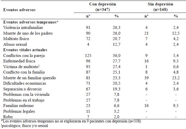 La mayoría de los pacientes con depresión (95,7%) experimentaron uno o más EVA en los 12 meses previos a la entrevista. Entre los que no tenían depresión solo 53% mencionó que fue afectado por estos eventos. El promedio de EVA fue de 2,4 entre los pacientes con depresión y 0,6 entre los que no tenían depresión. Los eventos más frecuentes fueron los conflictos interpersonales, padecer una enfermedad física y ser víctima de maltrato físico, psicológico y/o sexual (tabla 2).