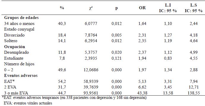Al realizar análisis bivariados se encontró que se asociaron significativamente con la depresión (p<0,05) la edad de 34 años o menos, el estatus de divorciado o soltero, estar desempleado, tener 1 o 2 hijos, o ninguno, experimentar eventos adversos en la infancia y 2 o más eventos vitales en el último año. Experimentar EAT incrementó en 5 veces la probabilidad de padecer depresión en la edad adulta. Los pacientes que experimentaron 2 EVA tuvieron 6,62 veces más probabilidades de estar deprimidos, la que se incrementó a 43,38 cuando la cantidad de eventos eran 3 o más (tabla 3).