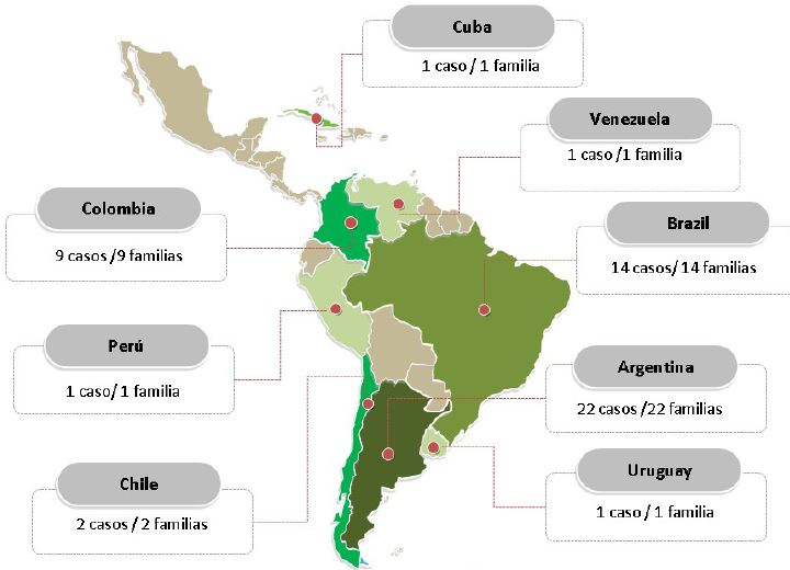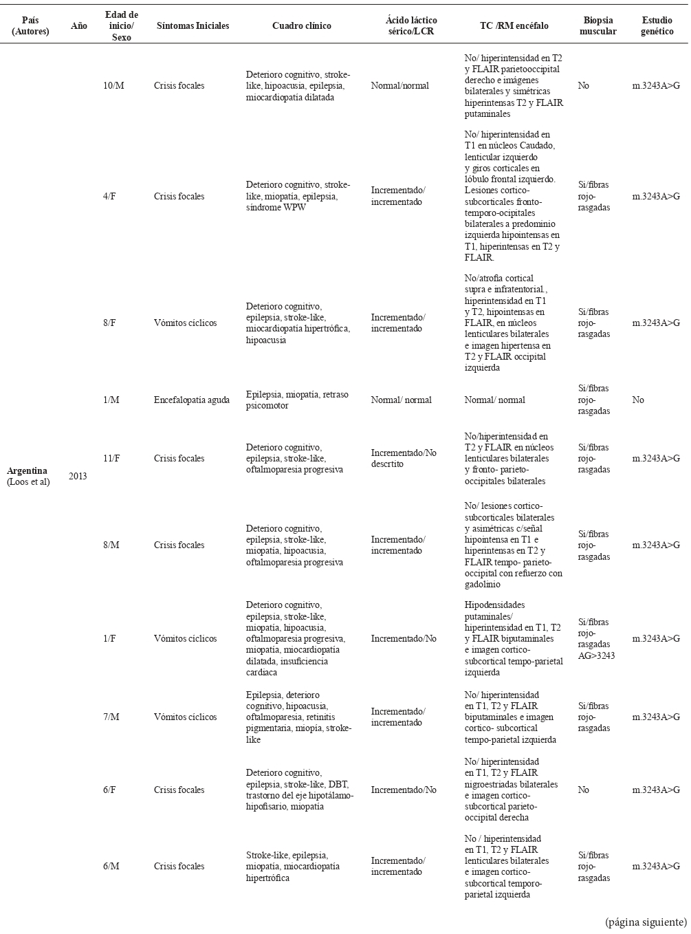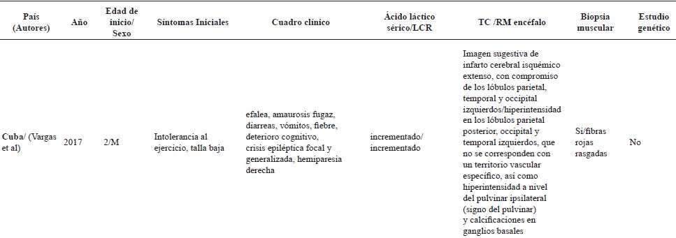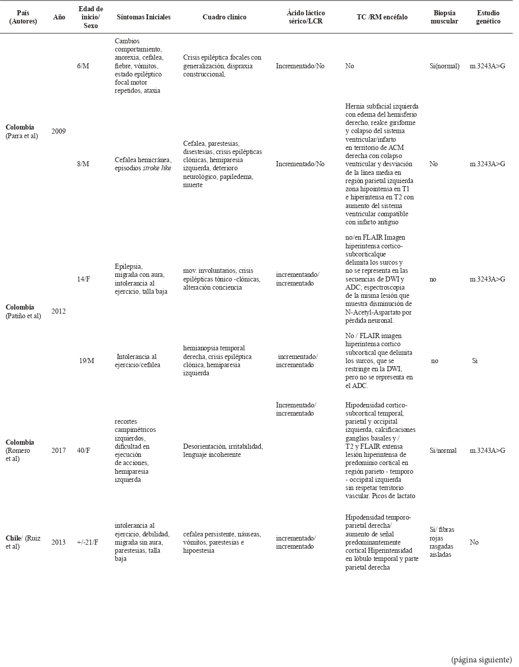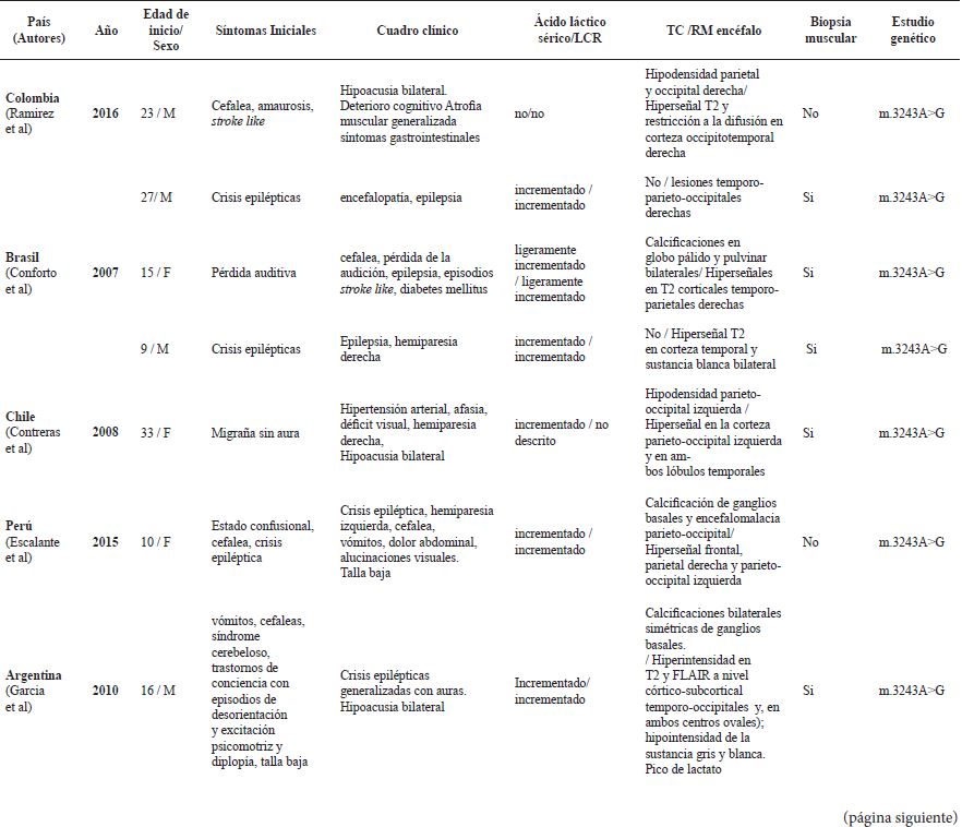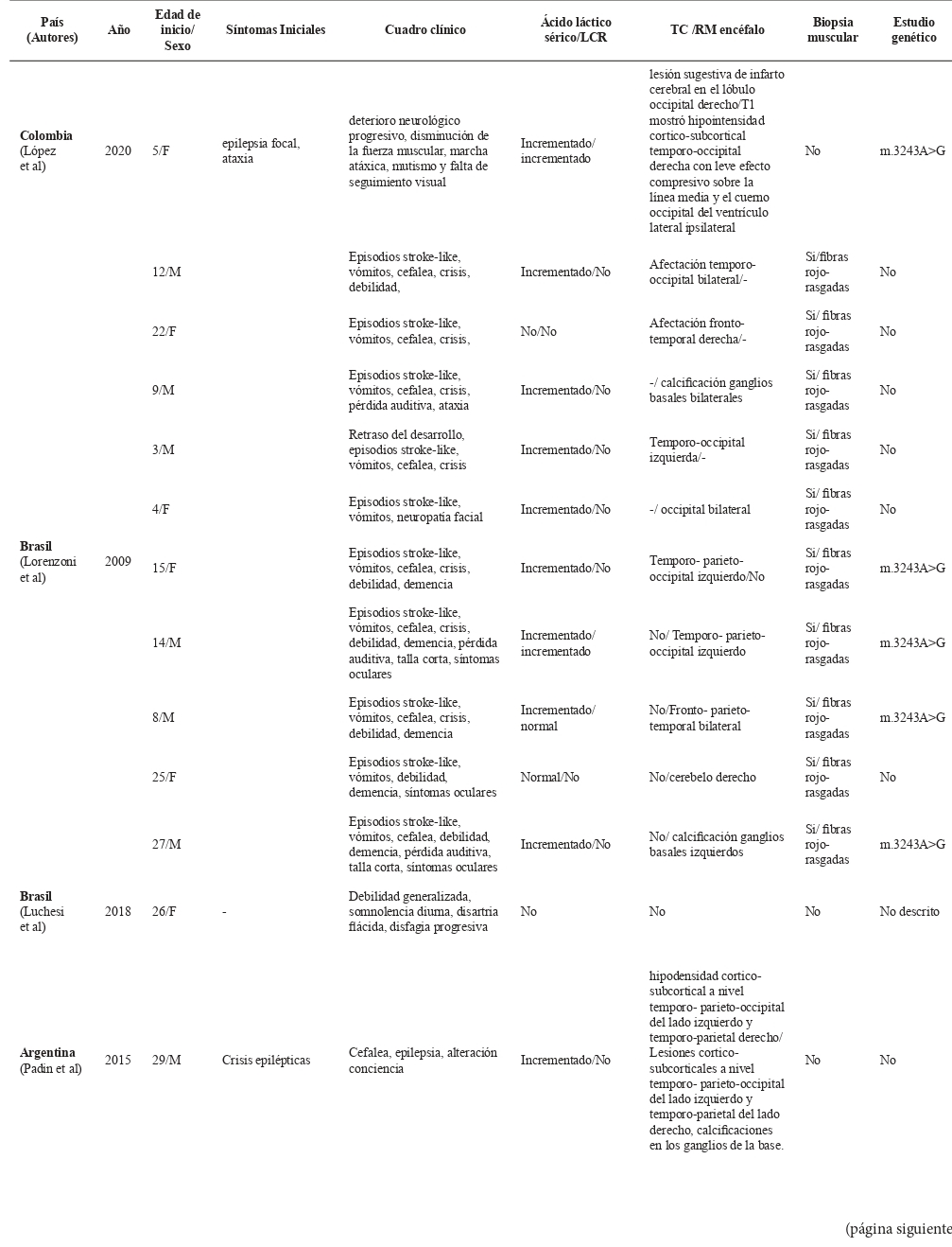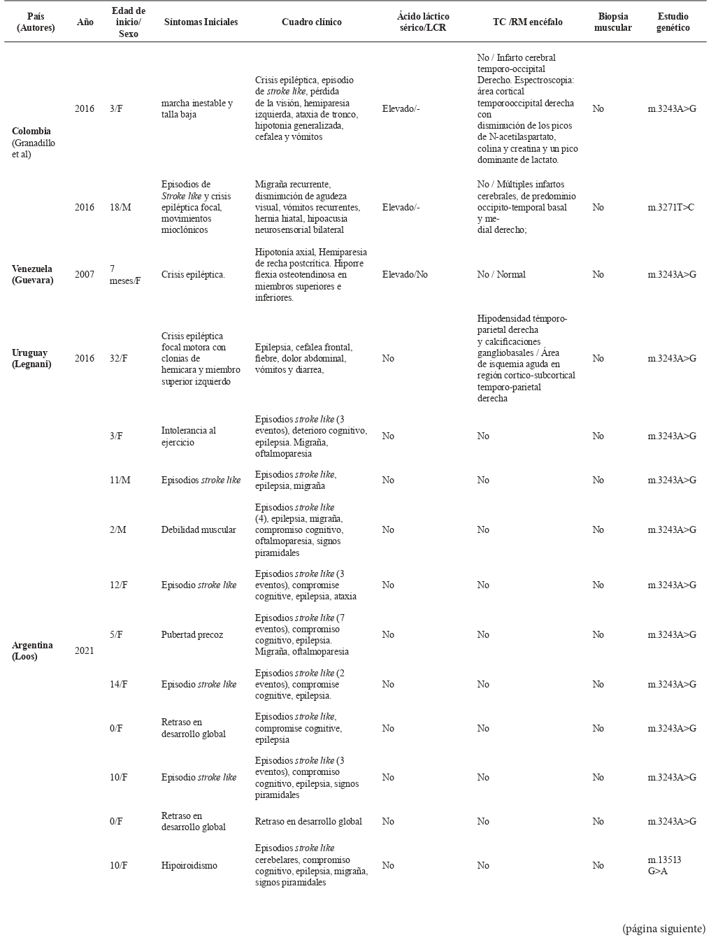La revisión de la literatura en Latinoamérica mostró una cantidad reducida de casos de MELAS publicados. De estos no todos son casos confirmados con diagnóstico genético, siendo la mayoría de los reportes relacionados a la variante m.3243A>G, lo cual limita el conocimiento de la distribución de las variantes relacionadas a esta enfermedad en Latinoamérica; sin embargo, se encontraron similitudes en cuanto a las características clínicas y diagnósticas (figura 1 y anexo 1).