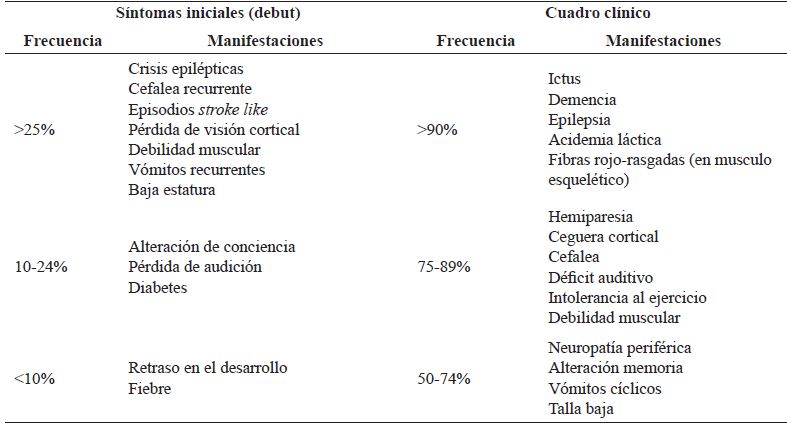 Las manifestaciones clínicas de MELAS se describen en la tabla 2. Las formas juveniles y las del adulto cursan con episodios similares a enfermedad cerebrovascular o stroke-like, cefaleas recurrentes y epilepsia (2,10). Hirano observó 6 manifestaciones cardinales: stroke-like, crisis epilépticas, acidosis láctica, fibras rojo rasgadas, intolerancia al ejercicio y comienzo de los síntomas antes de los 40 años en más del 90% de los 110 casos reportados (21). En las formas juveniles de MELAS predominan la baja estatura y el retraso en el crecimiento, mientras que en la forma adulta diabetes mellitus y pérdida auditiva (10).