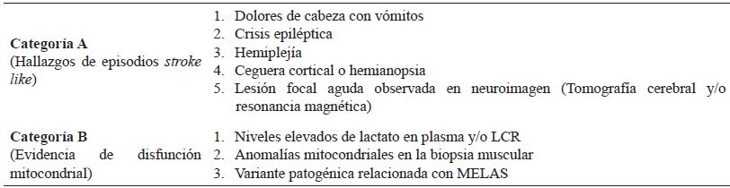 El diagnóstico clínico de MELAS ha variado en el tiempo, desde que se describió por primera vez. Se han publicado dos conjuntos de criterios, los primeros fueron dados por Hirano en 1992 al analizar 69 reportes de caso (4). En 2012 se plantearon nuevos criterios diagnósticos dados por el comité de estudio de MELAS en Japón (10), que establece el diagnóstico clínico definitivo de MELAS con dos criterios pertenecientes a la categoría A y dos criterios de la categoría B; y sospecha de MELAS con un criterio de la categoría A y dos criterios de la categoría B (tabla 3).
