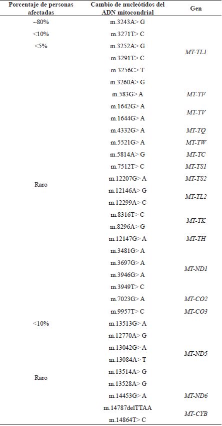 Las variantes patogénicas asociadas a MELAS (tabla 4), se detectan en ADN mitocondrial (MtDNA) extraído de leucocitos de individuos afectados. La heteroplasmia, característica de las enfermedades mitocondriales, puede generar una distribución variable del mtDNA, por lo que las variantes podrían solo detectarse en otros tejidos como mucosa bucal, sedimento urinario o mucho más consistentemente en musculo esquelético (22,33). La recomendación es realizar estudio genético en ADN mitocondrial extraido de al menos dos diferentes tejidos.