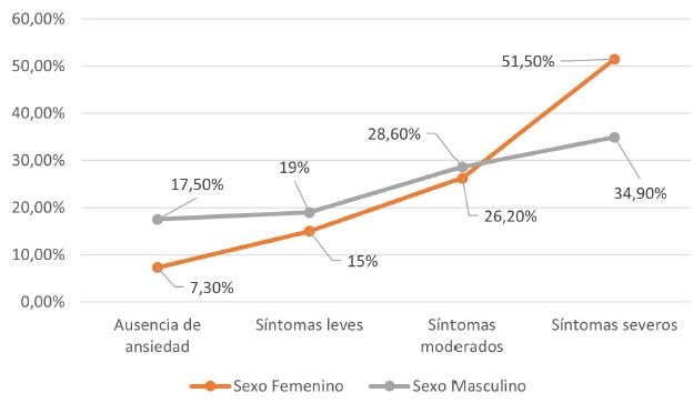 La interpretación total del GAD-7, explica que el 51,5% de las mujeres presenta síntomas severos de ansiedad, mientras que los hombres lo reportan en un 34,5%; puede deberse a que la mayor parte de la muestra se concentra en el grupo femenino (n = 233). Llama la atención que un 17,5% del grupo masculino no presenta síntomas de ansiedad (gráfico 1).