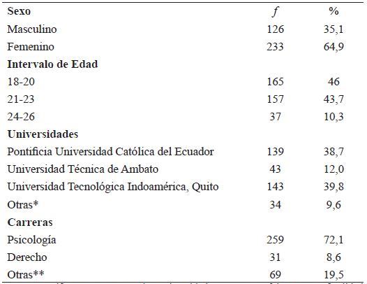 La muestra de este estudio fue de 359 estudiantes universitarios con predominio del grupo correspondiente al sexo femenino (64,9%). Participaron un total de diez universidades. La mayoría de la muestra se concentró en: Universidad Tecnológica Indoamérica (39,8%), Pontificia Universidad Católica del Ecuador (38,7 %) y Universidad Técnica de Ambato (12%); y un conglomerado (otras*= 9,6%) conformado por: Universidad Nacional de Chimborazo, Universidad Estatal Amazónica, Universidad de las Fuerzas Armadas, Universidad de Guayaquil, Universidad Autónoma de los Andes, Escuela Politécnica del Chimborazo, Universidad Central del Ecuador.