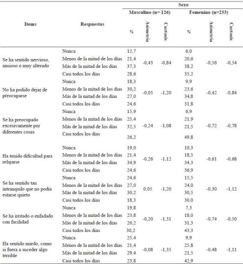 En la tabla 3 se describen los resultados obtenidos en la Escala de Ansiedad Generalizada para cada uno de los ítems y su respectiva escala de valoración Likert. En los ítems de sensación de nervios, ansiedad o alteración (ffemenino=38,2; fmasculino=37,3); y preocupación persistente (ffemenino=34,8; fmasculino=27,0), predomina el nivel de afectación “más de la mitad de los días” en el sexo femenino en relación con el masculino. Igualmente, en los ítems de preocupación excesiva por diferentes cosas (ffemenino=49,8; fmasculino=26,2); dificultad para relajarse (ffemenino=36,9; fmasculino=24,6), e irritación o enfado fácil (ffemenino=43,3; fmasculino=30,02), predomina el nivel de afectación “casi todos los días” en el sexo femenino en relación con el masculino. En sentido general, existe un predominio del sexo femenino ante el masculino, sin embargo, ambos presentan distintos niveles de trastorno de ansiedad generalizada.