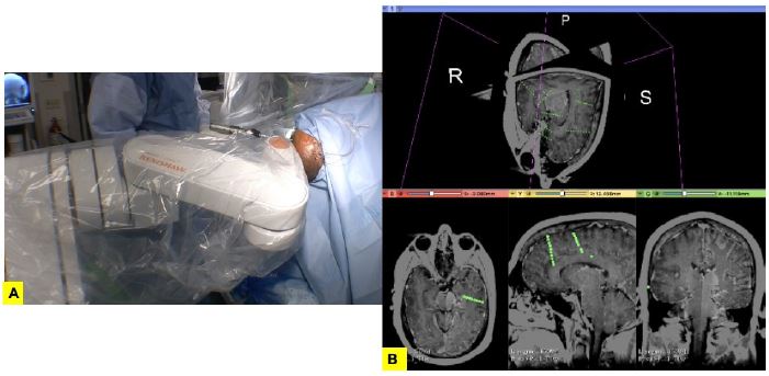 Robots en implantación de SEEG: existen varias plataformas, entre ellas, ROSA (Asistente Estereotáctico Robótico) (ZimmerBiomet/MedTech) y Neuro|MateTMRobot. (Renishaw/Reino Unido). Fueron diseñadas para SEEG y consisten en un brazo de 6 grados de movilidad y ángulos con base fija al piso. Se inserta directamente al ensamble que va al cráneo. Se realiza un co-registro de la IRM y tomografía del PCE (59) (figura 1).