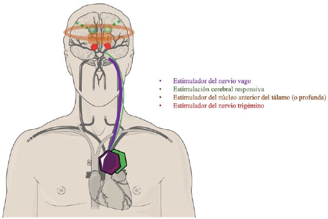 La neuromodulación de circuitos neuronales con implantación de sistemas de estimulación, incluyendo DBS (estimulador profundo cerebral), es una alternativa para aquellos PCE refractaria que no se benefician de resección (61). Entre las dianas terapéuticas se encuentra el núcleo anterior del tálamo (ATN), nodo central del circuito de Papez. Los mecanismos de acción antiepileptogénica del DBS aún no se conocen con exactitud (62,63). La eficacia de la estimulación de ATN se ha demostrado en crisis focales y generalizadas, con reducción de crisis de 71,3% a 1 año, 73,9% a 2 años, y en un rango de 61,8 - 80,0% desde los 3 a los11 años (64), nuestra experiencia indica que el DBS puede ser usado con mejor éxito en pacientes con epilepsia multifocal y sin complicaciones a largo plazo (65).