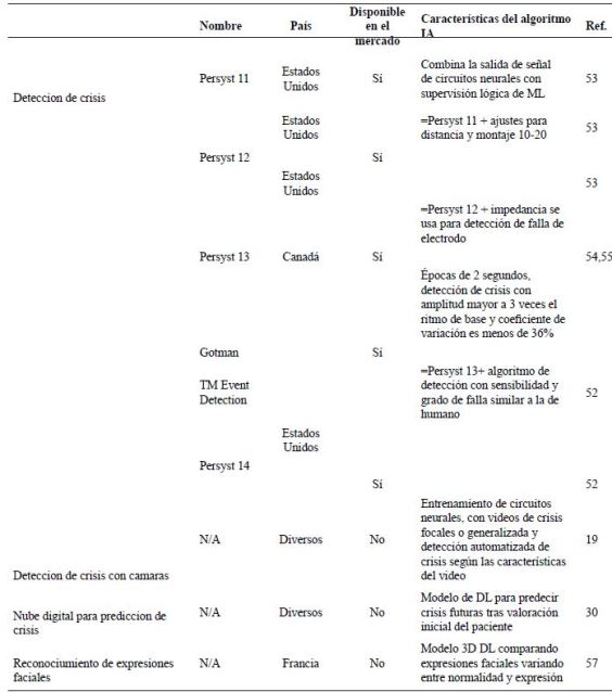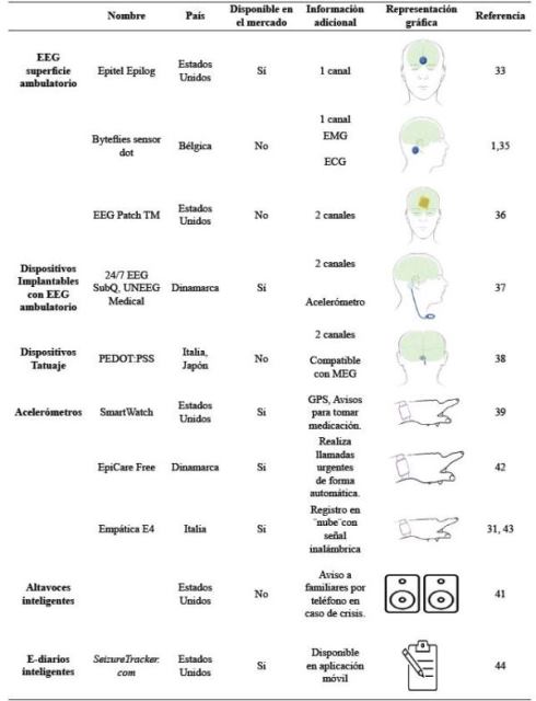 Uso de diarios electrónicos (E-diarios) para predicción de crisis: Utilizando “E-diarios”, se desarrolló un esquema con ML para predecir el riesgo de crisis a 24 horas según el registro de crisis auto-reportadas de los pacientes, 5000 pacientes ingresaron a SeizureTracker.com, donde incluyeron frecuencia de crisis, tipo de crisis, y duración. Un programa de IA de circuitos recurrentes y un esquema de DL pudo predecir riesgos de crisis a 3 meses. El resultado fue una predicción con pronóstico de crisis válida superior al chance (36), en la tabla 1 resume los dispositivos ambulatorios.