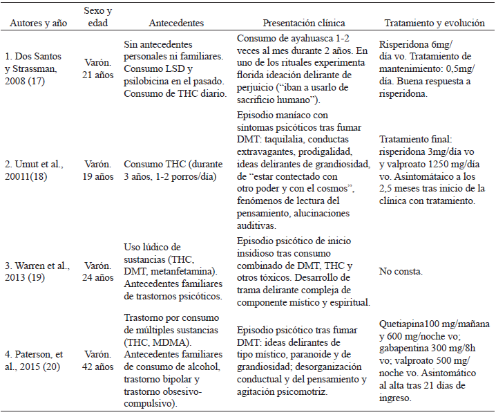 La presente revisión sistemática recoge los casos publicados en los que se ha relacionado la aparición de clínica psicótica o maníaca con el consumo de ayahuasca o DMT y la sintomatología se ha prolongado más allá del tiempo de acción de la sustancia, junto con un nuevo caso no publicado hasta la fecha.