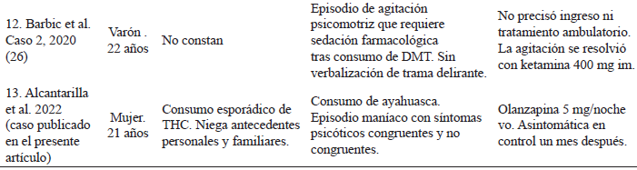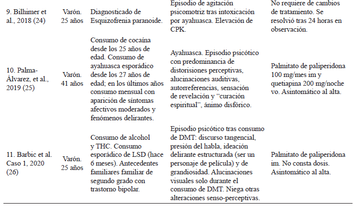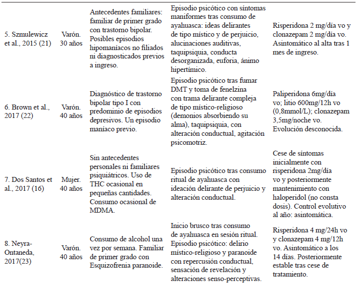 En los casos publicados hasta el momento que se recogen en esta revisión, sin embargo, tan solo dos casos de los trece tenían antecedentes psiquiátricos personales relevantes. Uno de ellos (24) fue un varón de 25 años con diagnóstico de esquizofrenia paranoide que presentó un episodio de agitación psicomotriz e ideación tanática tras la ingesta de ayahuasca. Sin embargo, a pesar del antecedente de trastorno mental grave, no desarrolló sintomatología de la esfera psicótica con el consumo. El otro caso se trataba de un varón de 40 años con trastorno bipolar tipo I, antecedentes de un episodio maníaco y predominancia del polo depresivo, que no había requerido hasta el momento hospitalizaciones psiquiátricas (22). En este caso el paciente presentaba un episodio de depresión bipolar refractario a fármacos, por lo que se había automedicado con 1 gramo de DMT vaporizado diario durante seis meses. A esto añadió, tras notar cierta mejoría, 60 mg de fenelzina diarios tres semanas antes del ingreso hospitalario. El paciente desarrolló sintomatología de la esfera psicótica y maniforme mantenida en el tiempo que precisó de tratamiento y hospitalización. Sin embargo, la presencia de fenelzina podría actuar como un factor confusor.