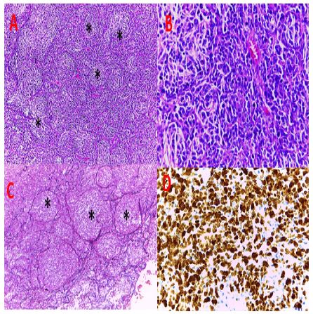 Paciente varón de 5 años de edad sin antecedentes clínicos relevantes, presentó un tumor ubicado en fosa posterior y en consecuencia, sometido a la resección total del tumor en agosto del 2013. El diagnóstico histopatológico fue meduloblastoma desmoplásico nodular (figura 1). Fue tratado con radioterapia cráneo espinal a dosis de 3600 cGy ,4000 cGy en campos holocraneales, seguido de “boost” en fosa posterior hasta los 5600 cGy en 30 sesiones. Además, recibió ocho cursos de quimioterapia con cisplatino, vincristina y ciclofosfamida; posterior al tratamiento se presentó estable con controles anuales. Cuatro años después, el paciente reingresa por emergencia con un cuadro de vómitos y cefalea. Luego de realizada una resonancia magnética con contraste, se encontró una tumoración captadora de contraste en fosa posterior, en la misma zona de la tumoración anterior. Fue sometido nuevamente a una resección total de la tumoración y el diagnóstico histopatológico fue glioblastoma grado IV OMS (figura 2). En base al diagnóstico, el paciente recibió radioterapia externa a dosis de 5600 cGy en 28 sesiones concomitante con temozolamida. Tres meses después de la cirugía, el paciente ingresa nuevamente a emergencia por presentar pausas respiratorias. Se procede a realizar una tomografía evidenciándose recurrencia local del tumor. No obstante, se le aplican cuidados paliativos y fallece a los cinco días.