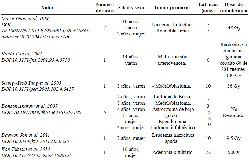 Salvati et al., revisaron 10 casos de gliomas inducidos por radiación entre 1970 y 2000. Los 10 casos descritos recibieron dosis totales que oscilaban entre 30 y 50 cGy, desarrollando todos glioblastomas después de un período de latencia media de 16 años (10). Posteriormente, se han notificado otros casos de glioblastoma inducido por radiación, después del tratamiento de una malformación vascular con “GammaKnife” en niños (9,21). Hay evidencia de que la radioterapia convencional al inducir tumores del Sistema Nervioso Central (SNC), está más relacionada con los meningiomas, pero la mayoría de los casos de tumores inducidos por radiación del SNC relacionados con el “Gammaknife”, son gliomas malignos (10).