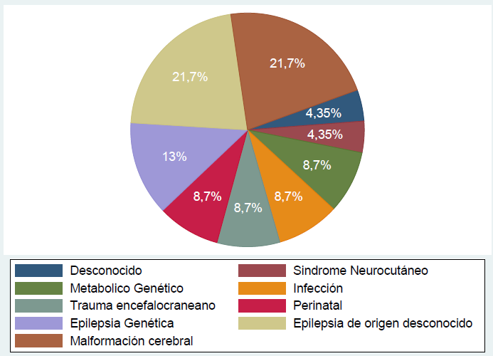 Un estudio previo encontró que la causa más frecuente de EE en niños era la malformación congenita del sistema nervioso central (23%), valor similar al encontrado en este estudio con 21.7% (28). Sin embargo, también se encontró el mismo valor para epilepsia de origen desconocido, lo cual puede ser explicado por tener un número menor de participantes y falta de estudios conclusivos en dos niños.