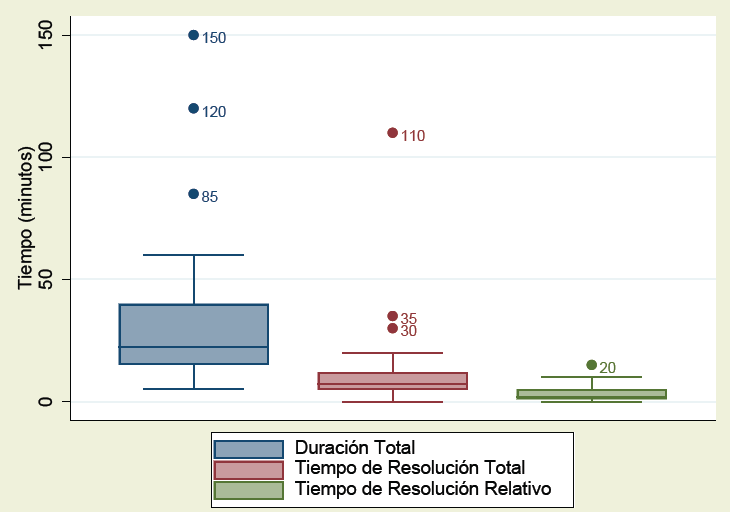 Con relación a los tiempos medidos, se halló que la mediana de duración total fue 22,5 minutos, siendo el más corto de 5 minutos y el más largo de 150 minutos. El tiempo de resolución total tuvo una mediana de 7 minutos y el tiempo de resolución relativo tuvo una mediana de 2 minutos (Gráfico 3).