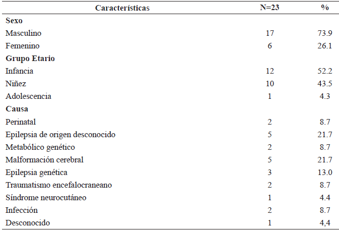 La mediana de la edad fue de 2 años, entrando la mayoría de los niños en la categoría “infancia” 52,2% (12/23). El 73,9% (17/23) fueron de género masculino, teniendo como causas más comunes a la epilepsia de origen desconocido y malformación cerebral, 21,7% (5/23) cada una, esta última subdividida en ventriculomegalias 8,7% (2/23), microcefalias 8,7% (2/23) y lisencefalia 4,3% (1/23). El resto de las causas se distribuyó en sintomáticas agudas como trauma encefalocraneano 8,7% (2/23) e infección afebril 8,7% (2/23); sintomáticas remotas como epilepsia genética 13% (3/23), perinatal 8,7% (2/23) y síndrome neurocutáneo 4,3% (1/23), sintomáticas progresivas como metabólico genético 8,7% (2/23) y criptogénica 4,3% (1/23). Ver Tabla 1 y Gráfico 1.