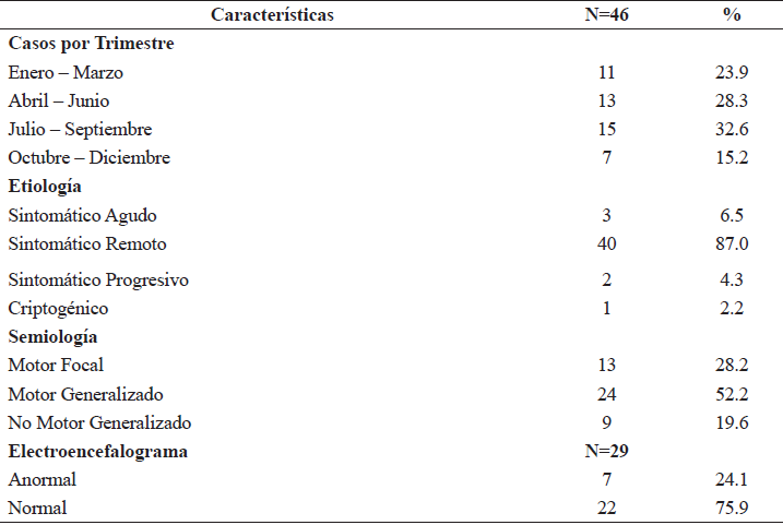 Con respecto a las características clínicas, la etiología fue principalmente de tipo sintomática remota, con 87% (40/46) de los casos. La semiología predominante fue de tipo motor generalizada, ocurriendo en 52,2% (24/46) de los casos y siguiéndole el tipo motor focal con 28% (13/46). Los EEG no fueron ictales y sólo se registraron en 63% (29/46) de todos los casos, de los cuales en 75,9% (22/29) fueron normales y 24,1% (7/29) anormales (Tabla 2).