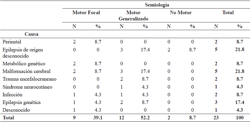 En cuanto a la semiología del EE organizado por causa, se halló que 34,8% (6/23) de los niños que presentaron semiología motora generalizada tuvieron como causa a la epilepsia de origen desconocido o malformación cerebral, con 17,4% cada una (3/23). Solo hubo 8,7% (2/23) de niños con crisis no motoras, los cuales tenían epilepsia de origen desconocido como causa (Tabla 3).