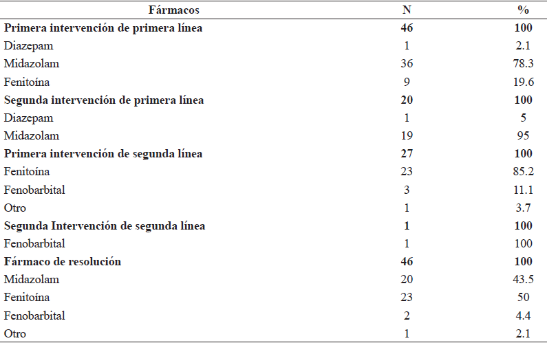 Referente al tratamiento, se encontró que en 78% (34/46) de los casos se inició tratamiento de primera línea con midazolam, seguido de la fenitoína con 19% (9/46). En 43,5% (20/46) de los casos se inició una segunda intervención en el tratamiento de primera línea, siendo tratados en el 95% (19/20) de esas veces con midazolam. En 58,7% (27/46) de todos los casos tuvieron una intervención de segunda línea, siendo 85% (23/27) con fenitoína y en 11% (3/46) con fenobarbital. Se realizó una segunda intervención de segunda línea en 2.17% (1/46) casos, usándose fenobarbital. No se realizaron terceras intervenciones de segunda línea ni se inició tratamiento de EE de tipo refractario. El fármaco de resolución identificado mayoritariamente fue fenitoína en 50% (23/46) de los casos, seguido de midazolam en 43,5% (20/46) casos (Tabla 4).