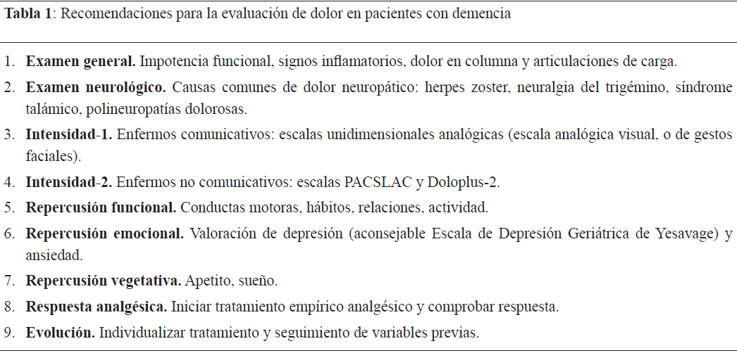 La evaluación competente de dolor (Tabla 1)(6), es un requisito necesario para un buen manejo del mismo e, idealmente, considera varias dimensiones, a saber, la intensidad, la ubicación, el afecto, la cognición, el comportamiento y los acompañamientos sociales. Los responsables del manejo de dolor deben estar adecuadamente informados al menos sobre la presencia e intensidad del dolor (6). El autoinforme a menudo se considera el "estándar de oro" en la evaluación de dolor. Actualmente se dispone de una amplia gama de escalas de autoinforme para evaluar el dolor, la mayoría de las cuales se han desarrollado y probado en personas mayores con demencia (7). A pesar de estudios que respaldan la confiabilidad y validez del autoinforme para personas con demencia, los profesionales de la salud y los expertos reconocen que el autoinforme por sí solo no es suficiente para estos pacientes que necesariamente están sujetos a estrategias de observación para la evaluación de dolor.(8) Refiriéndose al Mini Examen del Estado Mental, se sugirió una puntuación límite de 18 para dividir a los individuos en aquellos que aún pueden y aquellos que ya no pueden autoinformar el dolor (4).