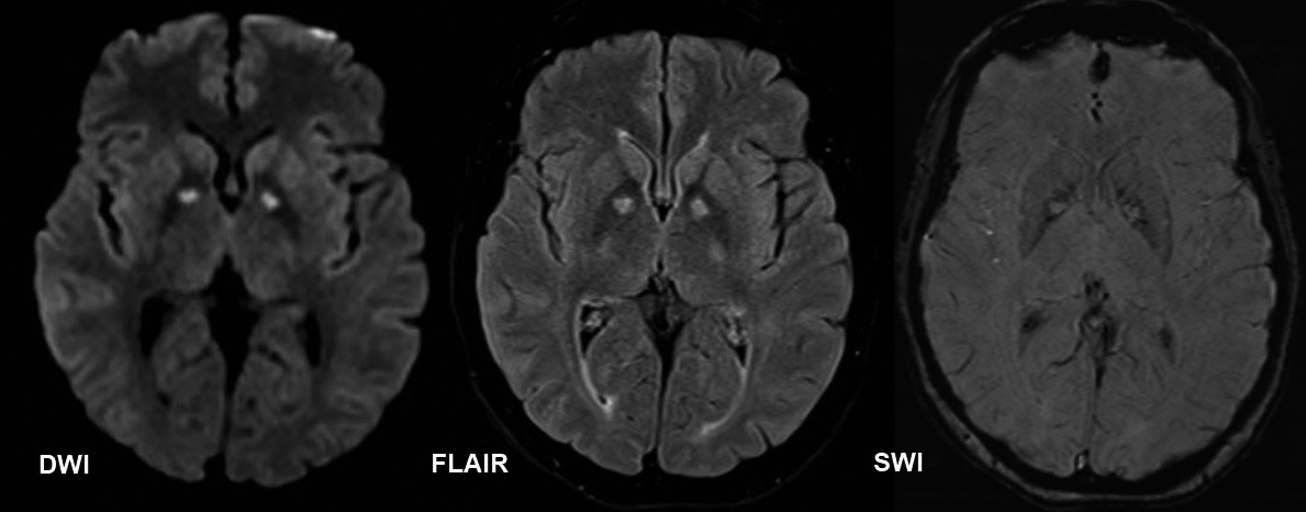 El delirium o falla cerebral aguda, es un síndrome neuropsiquiátrico grave que se caracteriza por la aparición aguda de déficits en la atención, el alertamiento y otros aspectos relacionados con la cognición. Por lo general, los pacientes evidencian alteraciones del estado de consciencia que fluctúan desde estados hipoactivos cercanos al coma hasta la marcada agitación psicomotora, usualmente acompañados de síntomas psicóticos altamente inquietantes como alucinaciones visuales y auditivas, desórdenes en la estructura del pensamiento e importantes variaciones del afecto (1). Es una patología frecuente en el ambiente hospitalario que se presenta en cerca del 80% de los pacientes que ingresan a las unidades de cuidados intensivos (1,2,3,4). Por tanto, el médico tratante debe tener un alto índice de sospecha ante la aparición aguda de alteraciones sutiles en el examen mental diario de sus pacientes. Para que ocurra el delirium, se requiere de la existencia de factores predisponentes como la edad avanzada, cambios involutivos cerebrales, noxas que afecten de forma crónica las estructuras del sistema nervioso central (por ejemplo, crisis convulsivas o consumo crónico de sustancias psicoactivas) y uno o varios factores que alteren de forma aguda la homeostasis cerebral tales como infecciones sistémicas, hipoxia, estados de choque, entre otros. La conjugación de los factores predisponentes y desencadenantes en el paciente susceptible desemboca en el síndrome clínico que subyace a una lesión orgánica grave, siendo esta una condición sine qua non para el diagnóstico. Como se demuestra en el caso reportado, coexistían diversos factores que facilitaron el desarrollo de alteraciones neuropsiquiátricas secundarias a una noxa cerebral o lesión isquémica del globo pálido bilateral, descubierto solamente cuando se identificó con claridad el cuadro de delirium y se avanzó en los estudios diagnósticos. Tristemente los desenlaces asociados al delirium son desalentadores: hasta un 20% persiste con algún grado de alteración de la cognición meses después, es un factor de riesgo para el declive cognitivo y progresión de la demencia en adultos mayores y se asocia con un riesgo mayor de morbimortalidad (1,2,4). En el caso reportado, una evaluación cognitiva de Montreal (MoCA test, por sus siglas en inglés) realizada previa al egreso evidenció un puntaje de 19/30 (función cognitiva anormal), con afectación de las áreas visoespaciales, de atención, abstracción y recuerdo diferido.