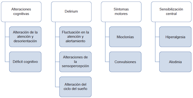 A lo anterior debe sumarse la posibilidad de concurrencia del síndrome de neurotoxicidad inducida por opioides, el cual corresponde a una variedad de síntomas y signos característicos que se manifiestan en los pacientes que han estado expuestos a este tipo de medicamentos tanto de forma aguda como crónica (figura 3). Se asocia a cualquier tipo de opioide, pero es más frecuente cuando estos generan metabolitos activos como morfina, meperidina, codeína, hidromorfona o metadona. Las poblaciones con mayor riesgo de sufrir este síndrome son los adultos mayores, los niños, las personas con déficit cognitivo y aquellas con historia de trastorno por uso de sustancias (26). No se conoce con certeza cuál es la fisiopatología subyacente a este síndrome, se cree que es de origen multifactorial y que se explica por la acumulación de metabolitos activos, acción sobre receptores NMDA en el sistema límbico y efectos deletéreos sobre la autorregulación vascular y trofismo cerebral. El manejo usual incluye la disminución de la dosis, rotación del opioide y en algunos casos la suspensión de estos (25,26,27).