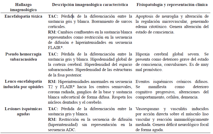 Ahora bien, con respecto a los pacientes usuarios de drogas de abuso, se conoce que están en mayor riesgo de sufrir ataques cerebrovasculares (isquémicos o hemorrágicos). El mayor riesgo se ha reportado con el uso de estimulantes como anfetaminas y la cocaína, siendo inusual que se presente esta complicación en las intoxicaciones por psico-miméticos incluyendo cannabis y los opioides. En relación con estos últimos, la mayoría de los eventos cerebrovasculares están asociados al consumo de heroína intravenosa, dado el riesgo de endocarditis y embolia de excipientes (5). Un estudio retrospectivo realizado en Irán y publicado en 2012, caracterizó los hallazgos tomográficos de los pacientes que consultaban por sobredosis de opioides, incluyendo 71 pacientes. Se reportó que el rendimiento para encontrar alteraciones intracraneanas en los pacientes con alteración mayor del estado de consciencia fue hasta del 20% (6). Con respecto a los hallazgos imagenológicos más frecuentemente encontrados en los pacientes que presentan intoxicaciones por opioides se incluyen: edema citotóxico, pseudo hemorragia subaracnoidea, leucoencefalopatía e infartos subcorticales (tabla 1) (7).