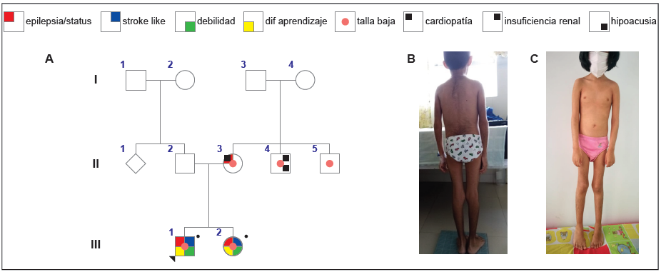 Niña que desde los 8 años Figura 1 (A: III2) y (C)) presenta fatiga a moderados esfuerzos, pobre ganancia ponderal y anemia. A los 9 años tuvo un estado epiléptico generalizado asociado a vómitos biliosos, fue tratada con fenitoína y luego con levetiracetam. Tres meses después, presentó un nuevo estado epiléptico clónico del brazo izquierdo, asociado a cefalea y vómitos, recibió fenitoína. Un año y medio después, ocurrió el tercer estado epiléptico focal con cefalea, vómitos, afasia, e hiperlactacidemia. El resumen cronológico de sintomas y examenes realizados se muestran en la tabla 1.