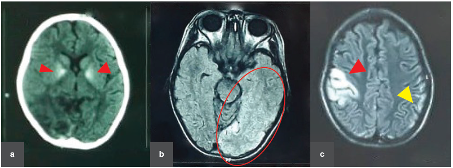 b) RMN cerebral, axial FLAIR (10años): hiperintensidad en región temporo parieto occipital izquierdo