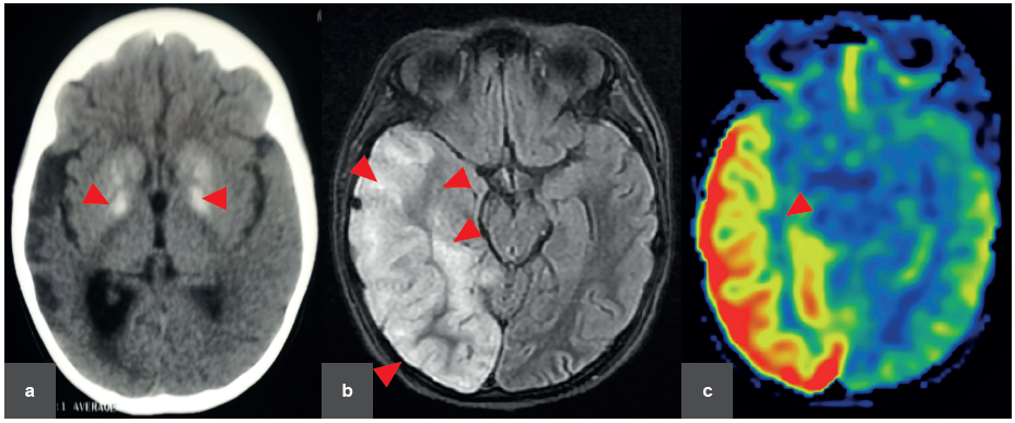 Los resultados de los exámenes de laboratorio fueron anodinos en todos los episodios de estado epiléptico; excepto, los niveles de lactato, los cuales fluctuaron entre 3 a 9,8mmol/L. La tomografía cerebral (TC) mostró calcificaciones bilaterales de núcleos de la base. Estudio de LCR realizado luego de segundo estado epiléptico fue normal. La Resonancia magnética cerebral (RMC) mostró hiperintensidad en el área temporo parieto occipital izquierdo en las secuencias T2 y FLAIR. La TC durante tercer estado epiléptico mostró lesión informada como infarto cerebral temporooccipital derecho. El electroencefalograma (EEG) inicial fue normal, y un segundo, durante el tercer estado epiléptico presentó ondas lentas en hemisferio derecho. La secuenciación NGS “next generation sequencing” de ADN mitocondrial identificó la variante m.3243A> G en el gen MT-TL1 con 66,2% de heteroplasmia compatible con SM.