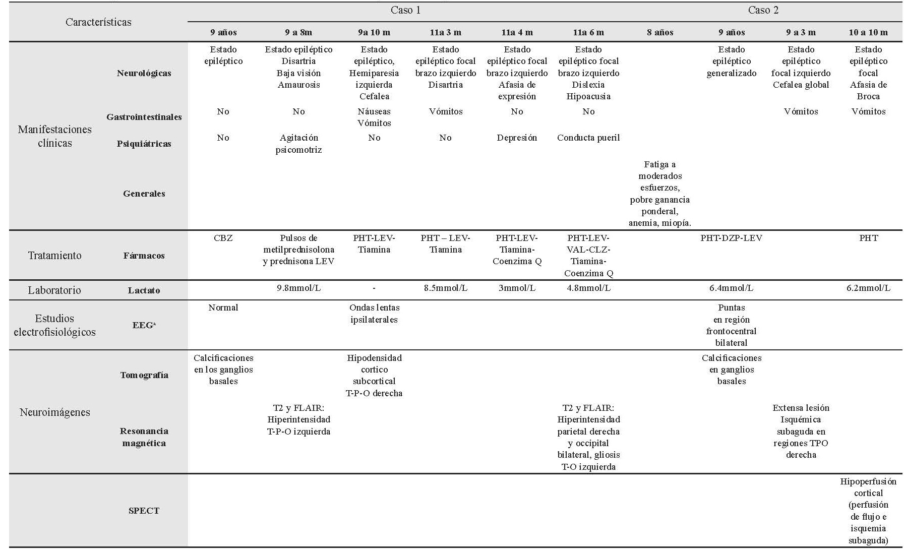 En conclusión, presentamos dos hermanos con SM de presentación juvenil asociada a la variante m.3243A > G-MT-TL1, con enfermedad caracterizada por estados epilépticos recurrentes, lactacidemia, déficit neurológico, lesiones semejantes a infartos cerebrales, falla de medro, microcefalia y pérdida de algunas habilidades adquiridas. Esta sintomatología debe considerarse en niños que presentan estado epiléptico, lactacidemia y lesiones que simulan infartos cerebrales.