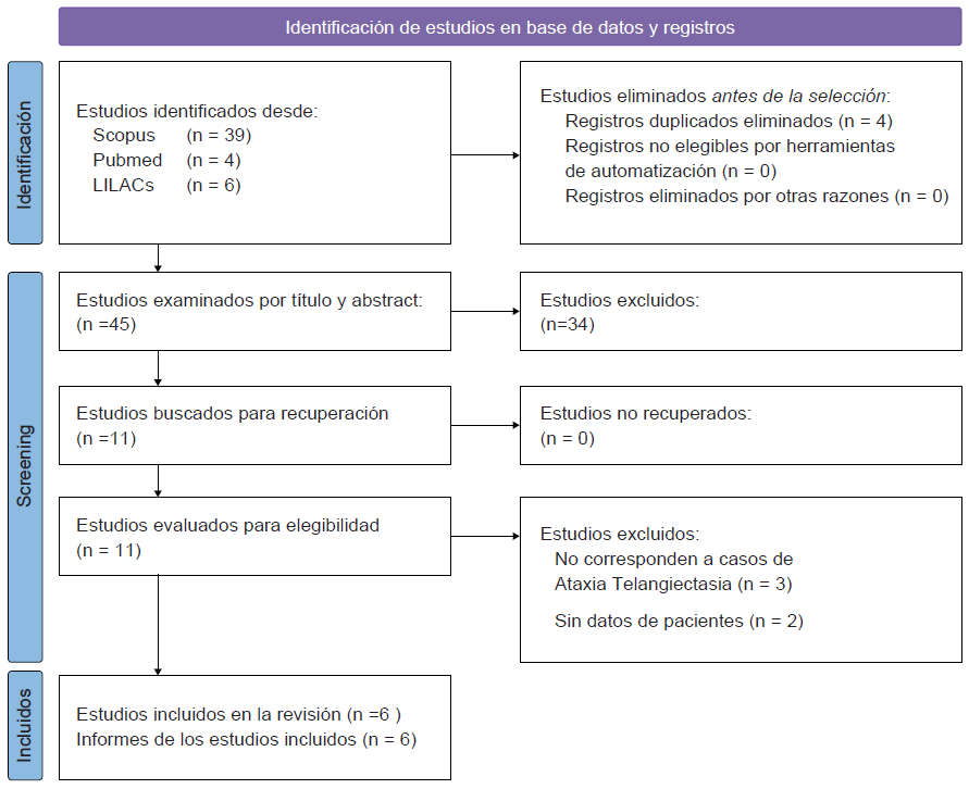 En el Perú, la AT está descrita en pocos reportes y series de casos. Realizamos una búsqueda sistemática según guía PRISMA (figura 1) de las bases de datos LILACs/Scielo, Medline/PubMed y Scopus con fecha de corte hasta el 30 de noviembre de 2022. La estrategia de búsqueda consistió en palabras clave como "Ataxia Telangiectasia", “Ataxia Telangiectasia Syndrome”, y otros términos relacionados tales como “Cerebello-Oculocutaneous Telangiectasia” y “Louis-Bar Syndrome”, restringiendo la búsqueda a Perú. Los criterios de inclusión fueron: 1) reportes de casos o series de casos de ataxia telangiectasia en Perú; 2) publicaciones que describieron datos sociodemográficos y clínicos de los pacientes (incluyendo datos individuales o agregados) y 3) disponibilidad del texto completo o resúmenes en inglés, español o portugués. Se utilizó el programa Rayyan para seleccionar los estudios y eliminar duplicados. Posteriormente se seleccionaron los reportes y extrajeron los datos en Microsoft Excel. Los datos extraídos incluyen: nombre del primer autor, año de publicación, sexo, edad de inicio, cuadro clínico e información relacionada al estudio genético. Se realizó un enfoque narrativo para sintetizar los estudios incluidos.