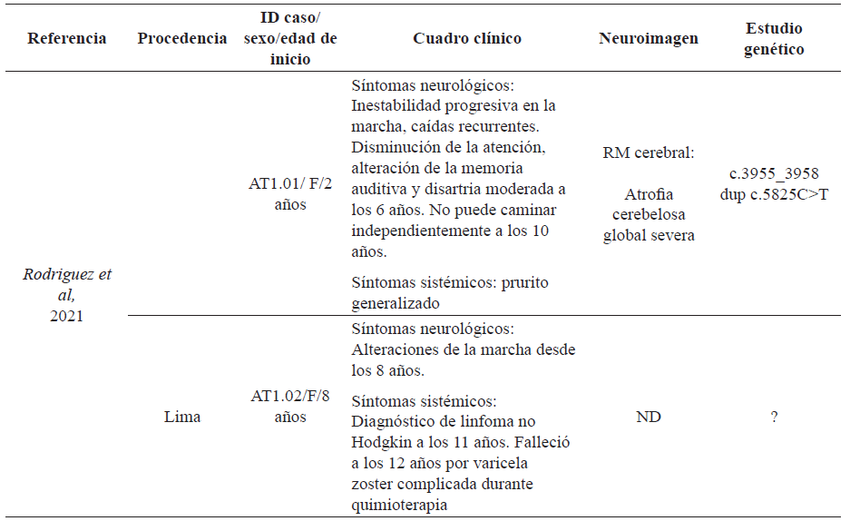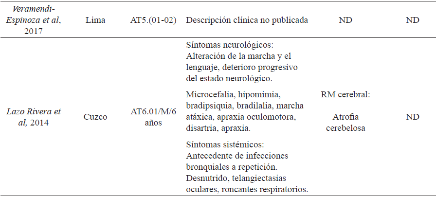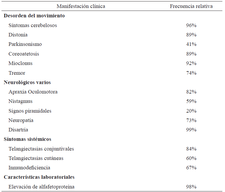 Las manifestaciones clínicas suelen empezar en la infancia e incluyen la ataxia cerebelosa, apraxia oculomotora, corea y disfunción cognitiva (2). La afectación multisistémica comprende inmunodeficiencia, endocrinopatía, radiosensibilidad, inestabilidad cromosómica y telangiectasia óculo-cutáneas. También se asocia con una alta incidencia de cáncer, predominantemente leucemia y linfoma. En los casos reportados en Perú, la edad de inicio fue de 3,1 años, con un intervalo de 1 a 8 años. La mayoría de ellos cursó con ataxia y síntomas cerebelosos, telangiectasias oculares, hipotonía e hipotrofia muscular. Los signos y síntomas de la AT y sus frecuencias relativas se resumen en la tabla 2.