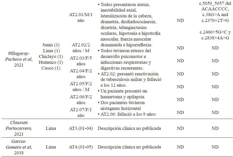 23. Villagaray-Pacheco N, Sociedad Científica de San Fernando, Lima, Perú, Franco-Bustamante K, Instituto Nacional de Salud del Niño San Borja, Lima, Perú, Córdova-Calderón W, Instituto Nacional de Salud del Niño, Lima, Perú. 8-years experience with ataxia telangiectasia: A series of 7 cases. Ro J Neurol. 2021;20(2):200-3.