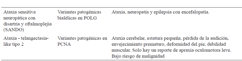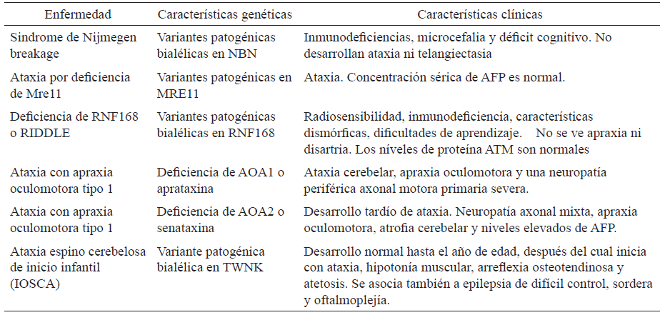 Dentro de las patologías que se pueden confundir con AT, encontramos la enfermedad AT-like tipo 2, síndrome RIDDLE, ataxia con apraxia oculomotora tipo 1 y 2, ataxia de Friedreich y ataxia espinocerebelosa con neuropatía axonal (Tabla 2)