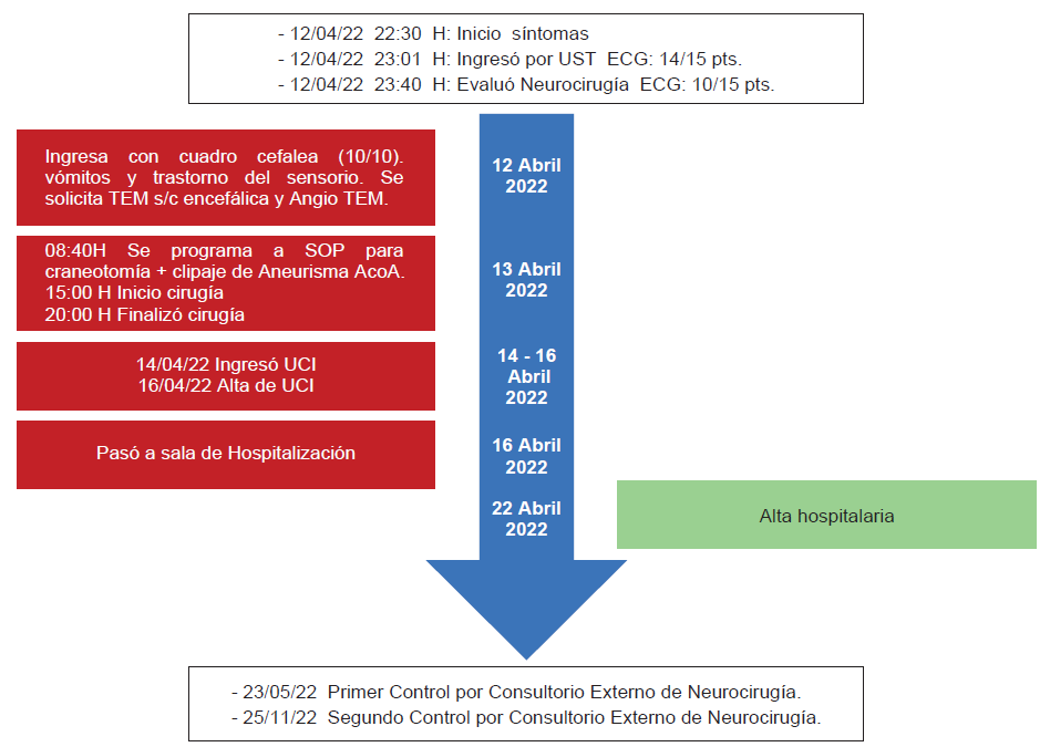 En neurocirugía, históricamente ha habido el dilema del tiempo para el manejo definitivo de una HSA por rotura aneurismática, sea del brazo endovascular o del microquirúrgico(5). Phillips et al. en su serie prospectiva de 459 pacientes con HSA por rotura aneurismática, definió una cirugía ultra temprana a aquella realizada menos de 24 horas de haber sido admitida al hospital; de ellas 230 casos fueron tratados dentro de lo propuesto; WFNS 3,4 y 5 fueron los casos más tratados en el brazo ultra temprano en relación al grado 1 y 2 (p=0,029). Wang et al. En su estudio de tratamiento ultra temprano de aneurismas informó en 114 pacientes tratados en <24 horas halló significancia estadística favorable en aquellos Fisher I-II con pobre grado neurológico (p=0,005), en la escala funcional modificada de Rankin a 6 meses ≤ 2 fue del 36,5% de la población (6). Sin embargo; en 2014 Oudshorn et al. el tratamiento del la HSA por ruptura aneurismática dentro de las 24 horas no tuvo asociación con mejores resultados funcionales en comparación con el grupo de pacientes operandos entre las 24-72 horas; este estudio tuvo un diseño retrospectivo, no randomizado(7). En nuestro medio no existe un flujograma de atención del paciente con hemorragia subaracnoidea; esta patología tiene una evolución tórpida y un alto índice de resangrado durante las primeras 24 horas, por ello se propugna su manejo definitivo temprano(4). Actualmente las guías internacionales de manejo indican el manejo temprano; AHA indica el manejo lo más pronto como sea posible (clase I, nivel de evidencia B); asimismo, European Stroke Organization (ESO) en 2013 indica su objetivo de tratamiento menor a 72 horas, sin importar el grado (nivel de evidencia III)(4,8,9). Todas concluyen que la principal causa es para evitar la tasa de resangrado posterior a una HSA.
