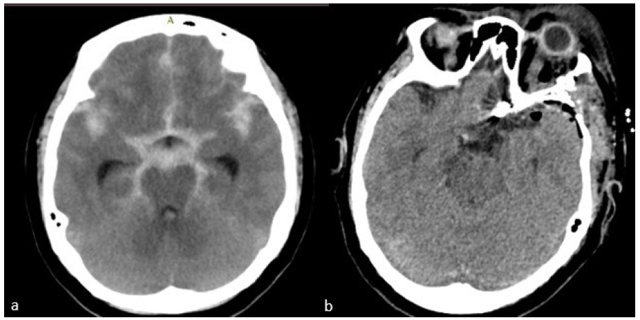 (a) hiperdensidad a nivel de cisterna silviana, carotídea, nterhemisfércia y perimesencefálica bilateral; presencia de cuernos frontales bilaterales, asociado a edema difuso. (b) Imagen postoperatoria. Hiperdensidad a nivel del complejo comunicante anterior en relación a clipaje realizado.
