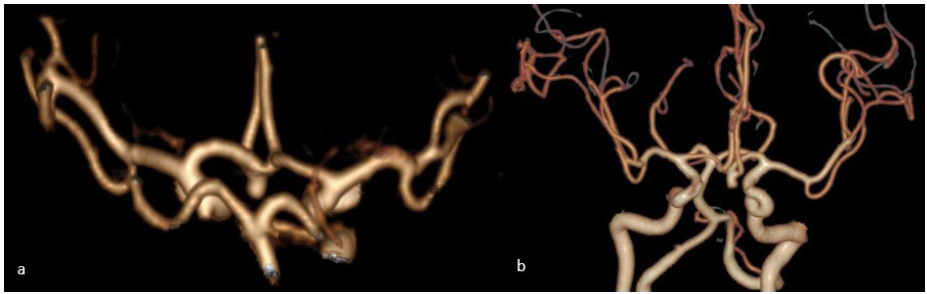 (a) Visión postero anterior se aprecia una dilatación aneurismática a nivel del complejo comunicante anterior con dirección caudal, presencia de ambos A1 y A2. (b) Se observa permeabilidad vascular de las ramas de la arteria cerebral anterior, no signos de vasoespasmo.