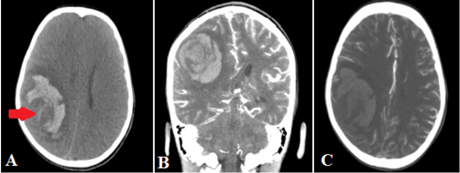 A: corte axial de tomografía cerebral sin contraste muestra hemorragia fronto-parietal derecha con imagen nodular en su interior (flecha roja), con desplazamiento de línea media y colapso de ventrículo lateral derecho. B: corte coronal de tomografía cerebral muestra hemorragia sin captación anormal de contraste. C: corte axial de angiotomografía cerebral no muestra malformación arteriovenosa asociada.