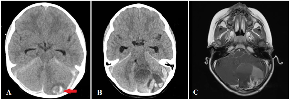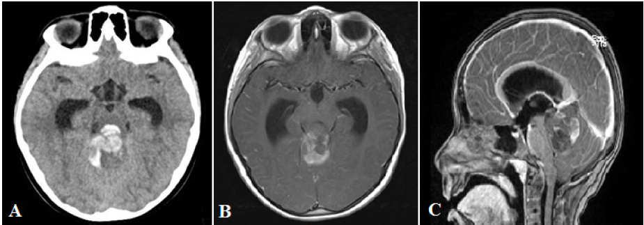 A: corte axial de tomografía cerebral sin contraste muestra sangrado a nivel de cuarto ventrículo con dilatación de cuernos temporales de los ventrículos laterales. B: corte axial de resonancia magnética cerebral con contraste evidencia proceso expansivo de fosa posterior con captación heterogénea de contraste. C: corte sagital de resonancia magnética cerebral con contraste muestra proceso expansivo dependiendo de vermis cerebeloso que produce severa compresión del cuarto ventrículo y dilatación del sistema ventricular.