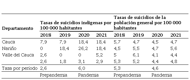 Las tasas de suicidios en indígenas mostraron que en Cauca, durante el período antes de la pandemia (2018-2019), se registró una tasa de 7,9 por 100 000 habitantes, que incrementó a 18,4 durante la pandemia (2020-2021). En el departamento de Nariño, la mayor tasa se presentó en 2020 con 26,2, la misma que disminuyó a 18,4 en 2021. En el departamento del Valle del Cauca se registró una tasa de 5,2 en 2021 y 2,6 en 2018. Finalmente, también se pudo comprobar que la tasa de suicidios en indígenas fue más alta que la registrada en la población general de la misma región durante la pandemia (2020-2021) (tabla 1).