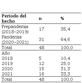 Las variables de tiempo indican que, del total de suicidios indígenas, en el período de prepandemia (2018-2019) se reportó el 35,4 % (n = 17) de los casos, y en el período pandémico (2020-2021) se registró el 64,6 % (n = 31) de los casos, que representa un incremento porcentual entre períodos del 45,1 %. Los años de mayor ocurrencia suicida de esta población fueron 2020 y 2021, con 31,3 % (n = 15) y 33,3 % (n = 16), respectivamente (tabla 2).
