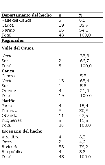 Con relación al departamento de presentación del hecho suicida, el 6,3 % (n = 3) de los casos correspondieron al Valle del Cauca; el 54,1 % (n = 26), a Nariño; y el 39,6 % (n = 19), a Cauca. Respecto a la ocurrencia del suicidio por regionales al interior de cada departamento, se tiene que para el Valle del Cauca en la regional sur se presentó el 66,7 % (n = 2) de los casos del departamento; para el Cauca en la regional norte se registró el 68,4 % (n = 13) de los casos; y para Nariño, la regional con más casos fue Obando con 42,3 % (n = 11) (tabla 3).